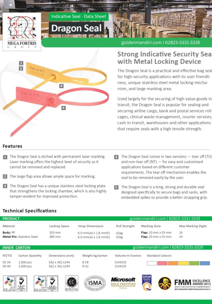 Dragon Seal adalah segel keamanan jenis plastic seal yang dirancang untuk memberikan perlindungan optimal terhadap berbagai aset dan peralatan penting. Terbuat dari bahan polypropylene (PP) berkualitas tinggi, Dragon Seal memiliki kekuatan tarik yang kuat namun tetap fleksibel, menjadikannya pilihan ideal untuk berbagai kebutuhan pengamanan logistik dan industri. Segel ini memiliki mekanisme pengunci internal berbahan logam (stainless steel insert) yang memberikan keamanan tambahan dan memastikan segel tidak dapat dibuka kembali tanpa merusaknya. Desain ekor panjangnya memungkinkan penggunaan yang fleksibel pada berbagai ukuran bukaan.