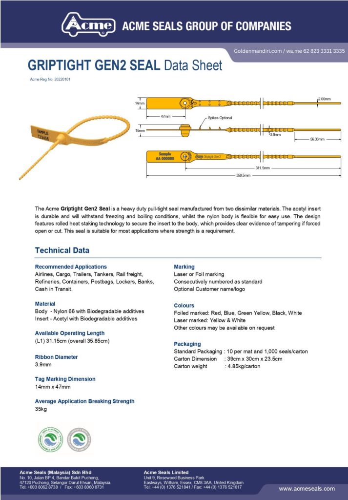 The Acme Griptight PP Seal is a versatile pull-tight seal manufactured from two dissimilar materials. The acetyl insert is unique in design as it incorporates two sets of locking teeth moulded in one insert, unlike similar seals requiring two separate inserts. The material will withstand freezing and boiling conditions, whilst the polypropylene body is flexible for easy use. The design includes rolled heat staking technology to secure the insert to the body, which provides clear evidence of tampering if forced open or cut. There is also a tear off tag for easy removal, making this a very user friendly seal suitable for most applications.