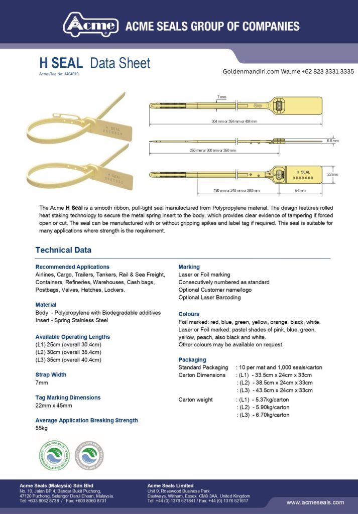 Segel ini sangat ideal digunakan pada berbagai aplikasi seperti tas keamanan, kotak distribusi, bagasi, hingga kontainer kecil. Dengan bentuk “H” yang khas dan struktur kokoh, H Seal mampu memberikan indikasi bukti bila terjadi pembukaan paksa (tamper evident), sehingga menjaga keamanan barang selama proses pengiriman atau penyimpanan.