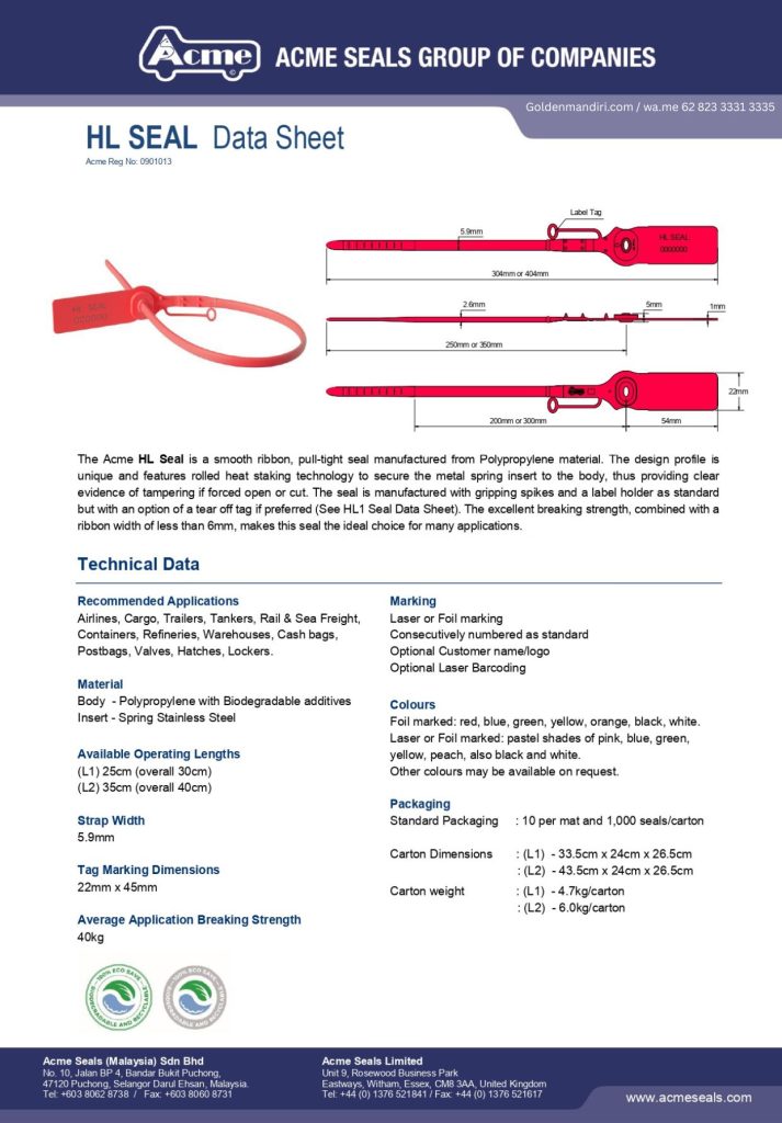 The Acme HL Seal is a smooth ribbon, pull-tight seal manufactured from Polypropylene material. The design profile is unique and features rolled heat staking technology to secure the metal spring insert to the body, thus providing clear evidence of tampering if forced open or cut. The seal is manufactured with gripping spikes and a label holder as standard but with an option of a tear off tag if preferred (See HL1 Seal Data Sheet). The excellent breaking strength, combined with a ribbon width of less than 6mm, makes this seal the ideal choice for many applications