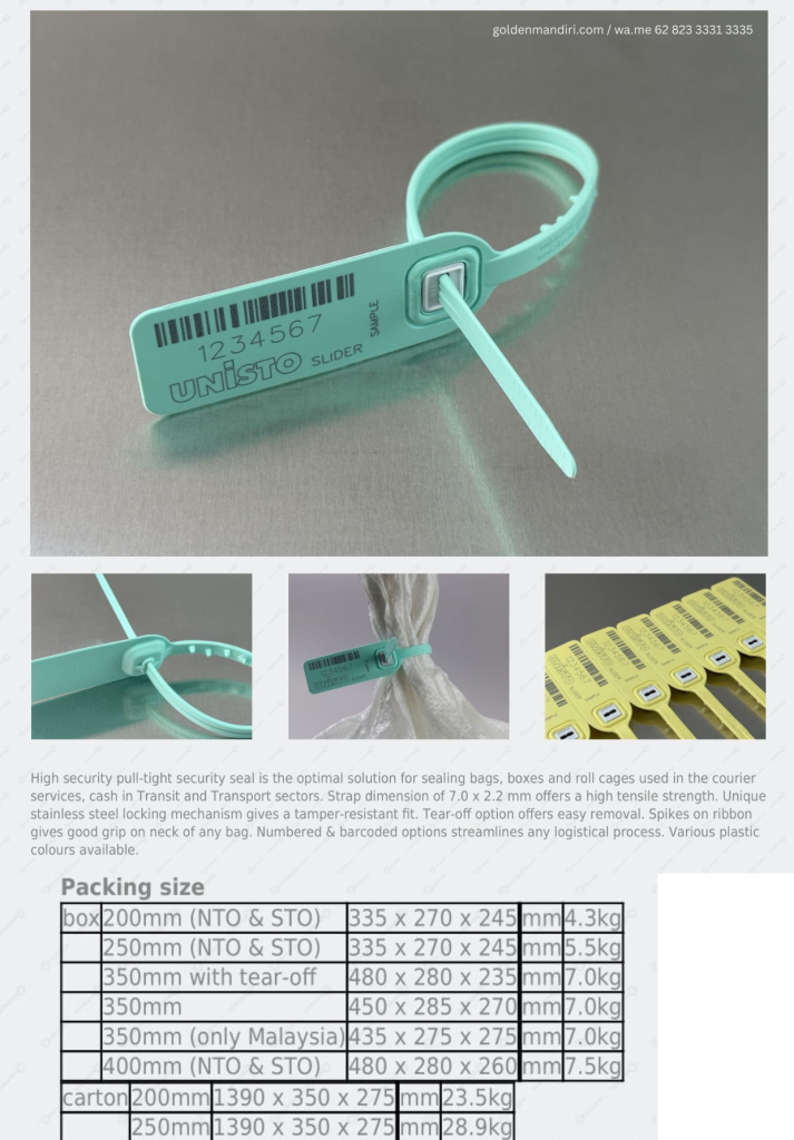 Segel pengaman tarik-ketat dengan keamanan tinggi adalah solusi optimal untuk menyegel tas, kotak, dan roll cage yang digunakan dalam layanan kurir, uang tunai di sektor Transit, dan Transportasi. Dimensi tali 7,0 x 2,2 mm menawarkan kekuatan tarik tinggi. Mekanisme pengunci baja tahan karat yang unik memberikan kecocokan yang aman dan tahan rusak. Opsi sobek memudahkan pelepasan. Paku pada pita memberikan cengkeraman yang baik di leher tas apa pun. Pilihan bernomor & berkode batang menyederhanakan proses logistik apa pun. Tersedia berbagai warna plastik.