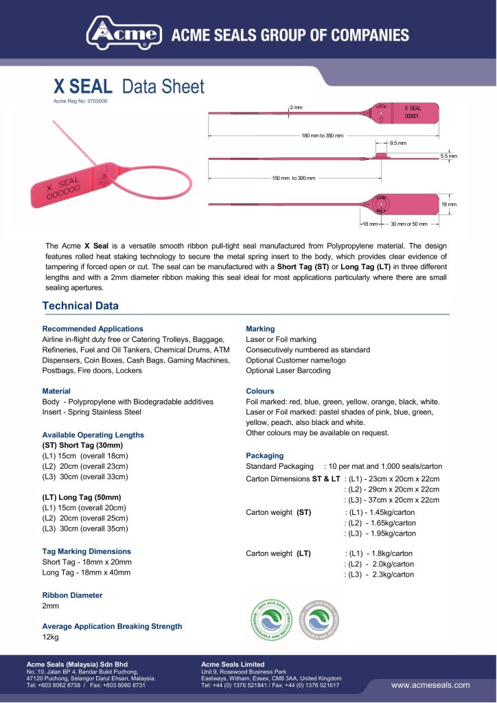 The Acme X Seal is a versatile smooth ribbon pull-tight seal manufactured from Polypropylene material. The design features rolled heat staking technology to secure the metal spring insert to the body, which provides clear evidence of tampering if forced open or cut. The seal can be manufactured with a Short Tag (ST) or Long Tag (LT) in three different lengths and with a 2mm diameter ribbon making this seal ideal for most applications particularly where there are small sealing apertures.